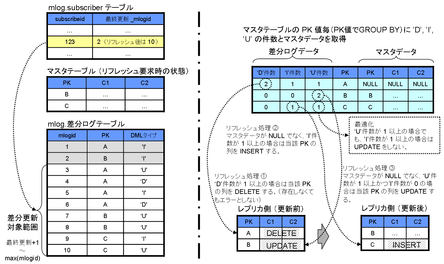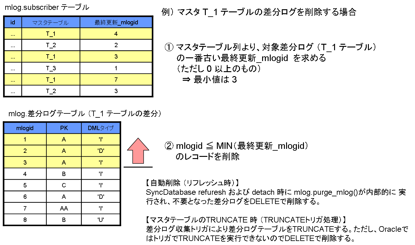 一つのマスタテーブルに対して複数のレプリカテーブルが関連付けられている場合は、その中の最小の「最終更新_mlogid」を求めた上で、最小の「最終更新_mlogid」以下の更新差分ログのみを削除します。 この処理はリフレッシュ処理時に自動的に実行されます。