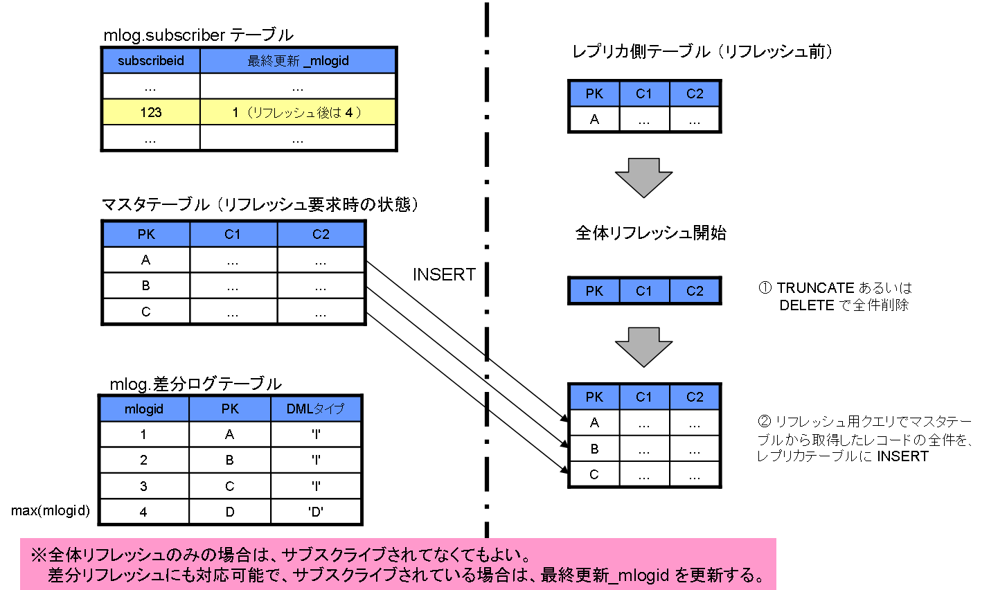 更新差分ログを利用しない全体リフレッシュ処理について説明します。