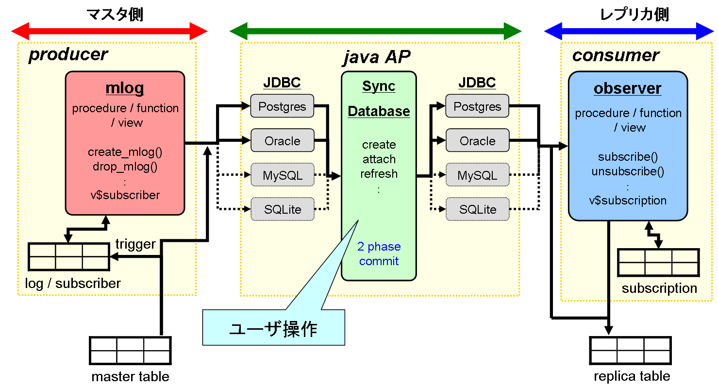 syncdb のDBモジュールは、マスタ側DBの更新差分ログ情報やマスタテーブルの関連付け情報を管理しマスタ側DB上で動作する mlog モジュールと、レプリカテーブルの関連付け情報を管理しレプリカ側DB上で動作する observer モジュールに分類されます。 Java AP の SyncDatabase は、これらDBモジュールを経由してDBにアクセスすることで、DBMSに依存しない実装となっています。 syncdb スクリプトは Java 実行環境を意識せずに SyncDatabase を実行させるためのラッパスクリプトとなります。